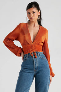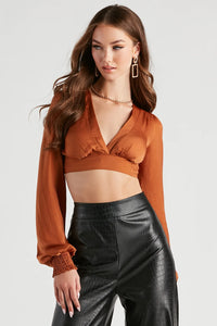 You'll be the chicest thing on the menu! Serve up major looks in this satin crop top featuring long bell sleeves, a plunge-open neckline, and a wrap-tie string that lets you customize the style. Complete your outfit in a mini skirt for dinner and drinks!