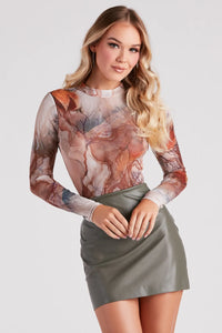 The perfect slay for your cabin in the woods trip! This sheer mesh bodysuit features long sleeves, a mock neck, an abstract print, and a thong bottom with dual snap-button closures. Complete the look in flare faux leather pants.