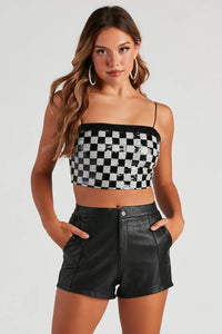 This checkered tube top is a total win in the fashion game! It features a sleeveless, square neckline, bungee spaghetti straps, sequin embellishments, a cropped hem, and a back zipper closure. Complete the look in sleek faux leather pants.