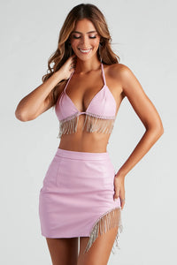 Shimmy your way to a sultry look in this rhinestone fringe halter bra with dual tie-back closures. The sleek faux leather fabric offers a moderate stretch. Complete the look in the matching skirt and heels.