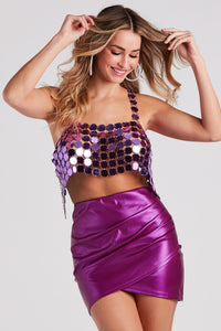 For the daring babes! Unveil your diva status in this chainmail crop top featuring a sleeveless square neck, tank-style straps, an ultra-cropped hem, and a backless design with four lobster clasp closures. Style with a fab mini skirt to complete the look!