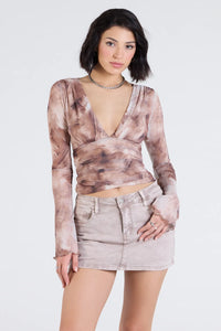This plunge neck print crop top will definitely get you attention! Standout from the crowd in this abstract print top with a sultry low-cut back and flattering cropped hem.