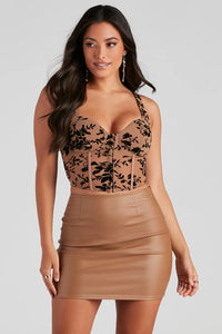 Create a dreamy-chic look in this sultry bustier bodysuit that was made for a night out! It features a sleeveless sweetheart neckline with padded cups, adjustable spaghetti straps for a customized fit, crochet panel detailing, a fitted, corset-style bodice, and a thong-cut bottom. Complete the outfit with faux leather pants and strappy heels.