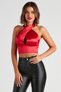 You'll be ready for happy hour with the girls in this sleek satin cropped blouse! It features a collared V-neckline, a tie-front, button-down design, long sleeves, and a cropped, form-hugging fit. Style with a mini skirt and heels!