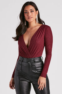 Showcase simple glam vibes in this glitter knit bodysuit that was made for a night out. It features a wrap-front design with a V-neckline, long fitted sleeves, a high waist seam, and a knit bottom. Style this shimmery bodysuit with faux leather pants and strappy heels.
