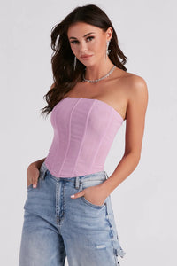 Hello hot stuff! You'll look absolutely gorgeous in this sheer mesh bustier! It features a strapless neckline, flexible boning to provide structure, a back zipper closure, and a mid-length hem with a form-hugging fit. Style with faux leather pants and clear heels for a night out.