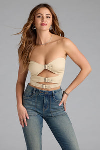 Stand out in this sassy crop top paired with some cute denim! Featuring dual front buckles and edgy cutouts, this crop top is perfect for making a bold statement.