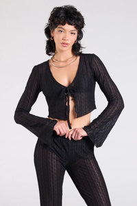 So boho chic, this sheer lace top is a style staple for festival season. Show off a trendy flair with the long bell sleeves and cute tie-front design.