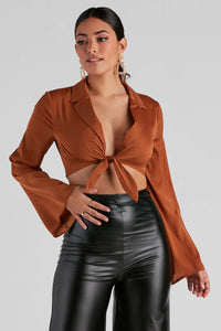 Let this satin top do the talking! Step out in this silky satin crop top featuring long bell sleeves, a collared v-neckline, and tie-front closure. Complete the look in sleek faux leather pants.