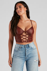 Sultry meets edgy for a late night with the girls! Create a sleek look in this faux leather crop top featuring a sleeveless V-neckline, adjustable spaghetti straps, a built-in padded bust, lattice front design, and side ruched seams. Complete the look in a chic ring set and jeans.