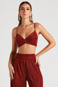 Enter the room of the rhythm and blues! All eyes on you in this saucy crop top featuring a sleeveless, sweetheart neck, adjustable spaghetti straps, and a twisted bust, on pleated-lined fabric. Complete the look in the matching bottoms.