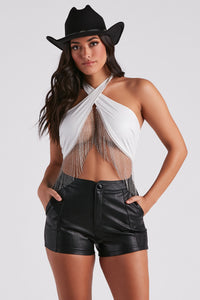 Play hard to get in this edgy faux leather crop top featuring a sleeveless halter neckline, wrap-style straps, ball-chain fringe, and a partial open-back. The smooth faux leather fabric offers minimal stretch. Complete the look in sleek high-rise pants and heels.