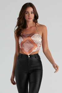Boho and chic with a view. This paisley satin scarf top features a square halter neck with chain detail straps and tie closure, cropped hem, and an open tie-back design. Complete your dinner look in a mini skirt and heels.