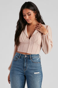 Life's a party and you'll look chic for it all in this chiffon top featuring peasant long sleeves, a collared plunge v-neckline, pleat detailing, and a corset-style crop hem with hidden hook-eye closures. Complete the look in jeans and a trendy ring set.