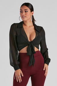 Showcase chic style moves in this sheer chiffon top! It features a collared V-neckline, long loose sleeves with tapered hems, a tie-front design, and a cropped fit. Complete the look with faux leather pants and strappy mules.