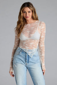 Show off the sweetest allure in this airy sheer floral lace top with long fitted sleeves and an asymmetric hem. Style over a bralette or tank for a trendy look.