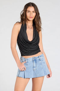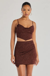 Dazzle in this sleeveless glitter crop top. With a cowl neckline, adjustable straps, and asymmetrical hem, it's your go-to for a night out. Pair with the matching mini skirt!
