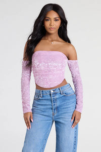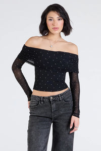 Let them take you out in this mesh crop top showcasing a sultry off-the-shoulder neckline with a wired notch insert and a cropped hem that flaunts your figure. Pair with mid-rise pants.
