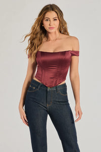 A satin corset top that keeps your look chic and sleek! The top offers a sultry off-the-shoulder neckline, flexible boning for a snatched appearance, and a curved crop hem perfect for styling with jeans.