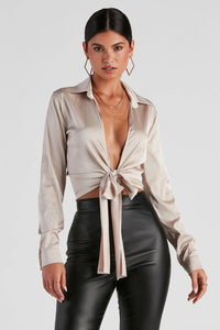 Keep it so sleek in a tie-front blouse that creates a stunning impression! The blouse features a collared neckline, long sleeves with a double-button cuff, a tie-front, and a cropped hem. The top is composed of a silky satin-like fabric that offers a relaxed fit with minimal stretch. Complete look with high waist jeans and mules.