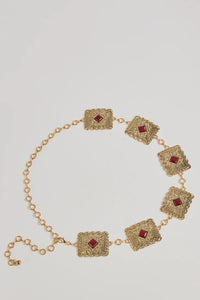 This western-inspired chain belt features large square shapes with colored stones and is secured with a lobster clasp closure. Perfect for cinching any outfit together.