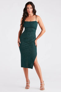 This glitzy glitter knit midi dress will catch the lights gorgeously! It features a sleeveless square neckline, spaghetti straps, a pleated side seam, a midi-length hem with a chic thigh-high side slit, and a bodycon silhouette. The glitter knit fabric offers plenty of stretch. Style this midi dress with lace-up heels for a glam party look.