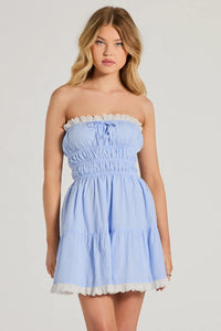 Spread your sunshine in this gingham skater dress for the sweetest look all summer! The strapless neckline, lace trim, and stretchy smocked waist create a flirty and comfortable look. The skater silhouette and ruffled mini-length hem with lace trim add a touch of cuteness to your look. Complete the look with a crossbody purse and sandals for any casual plans!