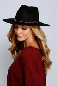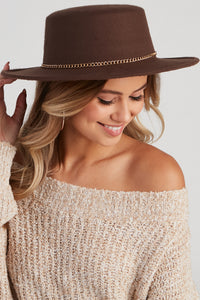 Top off your look in this chic boater hat featuring a chain link, short brim. The hat is composed of faux wool material. Complete the look with a denim jacket and booties.