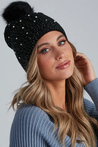 Bring the luxe with a beanie that adds that sparkling touch to your outfit. The beanie features a knit body, faux pearl accents, rhinestones, and a faux fur pom pom accent. Complete look with a sweater and high waist jeans.