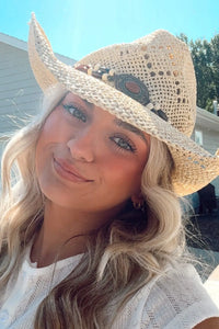 Capture a chic western look with this beaded straw cowboy hat to top off your concert or festival outfit!