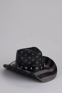 Perf for all the patriotic babes, this cowboy hat features an Americana design with a stars and stripes print and a center band accented with metal stars.