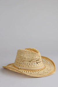 Add a cute western vibe to your beachy looks with this straw cowboy hat featuring a woven design, braided rope center accent, and long chin strap with a beaded detail.