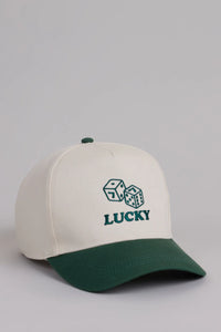 Serve all the lucky vibes in this trendy two-tone baseball cap featuring a dice embroidered graphic with the number "7" and a script that reads, "Lucky."