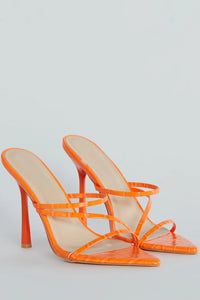 Amp up your 'fits with these croc faux leather stiletto mules! Designed with a faux leather material with a chic croc-embossed pattern, they feature a sleek stiletto heel, an open pointed toe, and an asymmetric strappy design across the foot. The open back offers effortless on-and-off styling. Pair these mules with statement earrings for a rooftop bar!