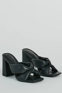 Your looks are always chic and on point, so these sleek faux leather mules are a staple for your outfits. They feature a sturdy block heel, an open square-shaped toe, and a puffy strappy design with a knotted center detail. The open back offers effortless on-and-off styling. Pair these mules with a cute handbag.