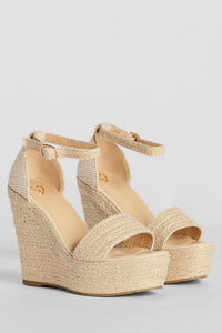 Capture the effortlessly chic vibe of the summer season with these espadrille platform wedge heels! They feature an open almond-shaped toe with a wide toe strap, a thin adjustable ankle strap with a buckle closure, a closed back with a woven design, and a tall platform wedge heel for a beachy boho look. Style with a pearl necklace and hoop earrings.