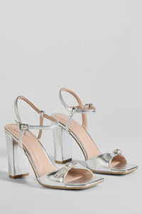 Glamour Up Rhinestone Strappy Metallic Heels Glamour Up Rhinestone Strappy Metallic HeelsGlam up your dress in these metallic heels for semi-formal or formal occasions! Features a square toe and rhinestone embellished asymmetrical straps, a thin block heel, and a lightly cushioned footbed to provide both style and comfort. Complete the look with a rhinestone clutch purse. Fit & Features - 3" Thin Block Heel