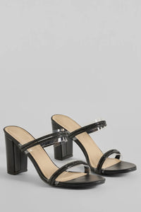 All The Glam Rhinestone Clear Strap Block Heels All The Glam Rhinestone Clear Strap Block HeelsIf you love to be glam these faux leather block heels give your outfit the perfect touch! They feature a round toe and clear PVC straps with rhinestone embellished straps and a block heel. Complete the look with a trendy purse for going out. Fit & Features - 3.5" Block Heel