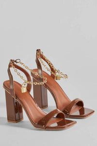 Locked In Chain Ankle Patent Block Heels Locked In Chain Ankle Patent Block HeelsEdge up your style game in these patent block heels for a unique and trendsetting look! Featuring an on-trend square toe, a block heel, and a chain ankle strap with a lock charm and lobster clasp closure to secure the style. Complete the look with a trendy purse for any plans! Fit & Features - 4" Block Heel