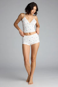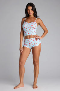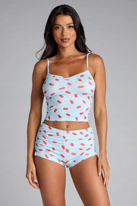 Sleepover-ready and snack-cute approved. These ruched pajama shorts bring the fun to bedtime with a cheeky print and ultra-comfy fit. Pair with the matching pajama top!