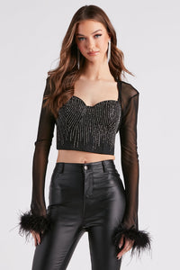 Embrace your diva-darling status by layering on this mesh bolero over your formal dress! It features fitted long sleeves with a marabou feather trim, an open front design, and an ultra-cropped hem. Complete the look with fringe earrings.