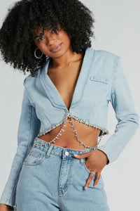 Oh So Icy Rhinestone Trim Crop Denim Blazer