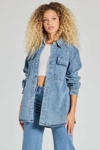 This medium-wash denim shacket will be your new casual fave style featuring a collared neckline, long sleeves with button straps for a cuffed look, a complete button-down front, large flap pockets, and the perfect relaxed fit. Layer over a crop top and high-rise bottoms.