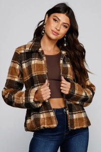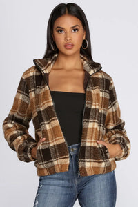 Keep it cozy in trendy plaid this season! The jacket features a flat collar, a zippered down front, long sleeves with elastic cuffs, hidden pockets and an all over plaid print. Jacket is composed of a faux fur fabric that offers a relaxed fit with a slight stretch.
