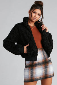 Keep your coolness in check with this faux sherpa bomber jacket perf for casual styling! It features a collared neckline, long sleeves with tapered hems, a zip-front design, lined side pockets, and a relaxed fit. The lined cozy faux sherpa fabric features a trendy checkered print pattern. Layer this bomber jacket over a crop top with faux leather pants and combat boots!