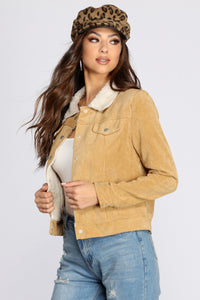 Mix and match with textures! This corduroy jacket is a season must have! Designed with a sherpa lining, long sleeves, a collared neckline, and smooth metal button closures down the center. Jacket features faux breast pockets, and a hem that hits just passed the waist line. Composed of a faux fur lining and a cordoroy outer offering no stretch and a form fit.