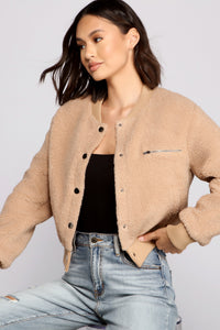 Layer on this cute teddy bomber jacket for a trendy touch to your everyday look! It features a complete snap button front with an overall relaxed fit. Pair this jacket with a basic tee and distressed denim for a perfect casual winter 'fit.