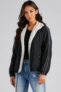 Layer on this trendy reversible jacket for a cozy-chic vibe! It features a reversible design with a sleek nylon exterior and a soft faux fur interior. The jacket has a mock neckline, long sleeves, a complete zip front, and an adjustable drawstring hem. Style this jacket over a basic tee with denim for a casual look.