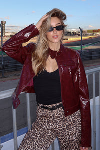 Take no prisoners, babe—this faux leather moto jacket brings all the rebel energy. Cropped and fitted with a glossy finish, it’s made for nights when you want to look unstoppable.