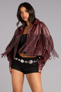 Cause a scene when you step out in this faux leather crop shacket with edgy stud trim and fringe detailing that spices up any concert or festival!